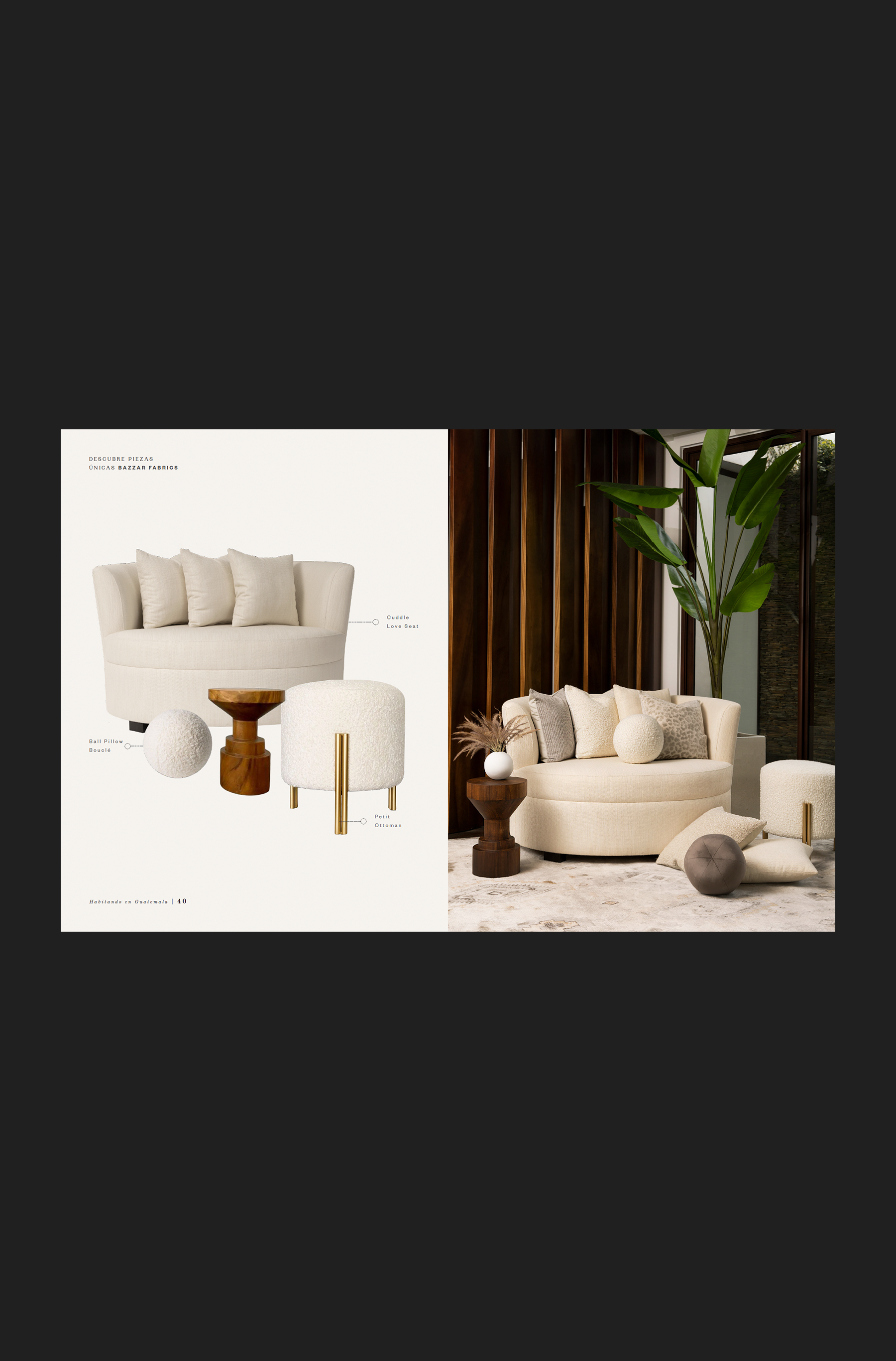 Editorial design for Bazzar Fabrics, a brand dedicated to interior design in Guatemala, offering a wide range of decorative textiles and elements to beautify any space, with over 2000 designs in fabrics, furniture, and accessories. They collaborate with prominent interior design professionals to provide free consultation, custom product tailoring, design, and made-to-measure furniture production and design. Through inspiring interviews, they aim to cultivate environments in homes where ideas flow, and environments can be created that reflect each individual's personality, believing in the transformative power of interior design.